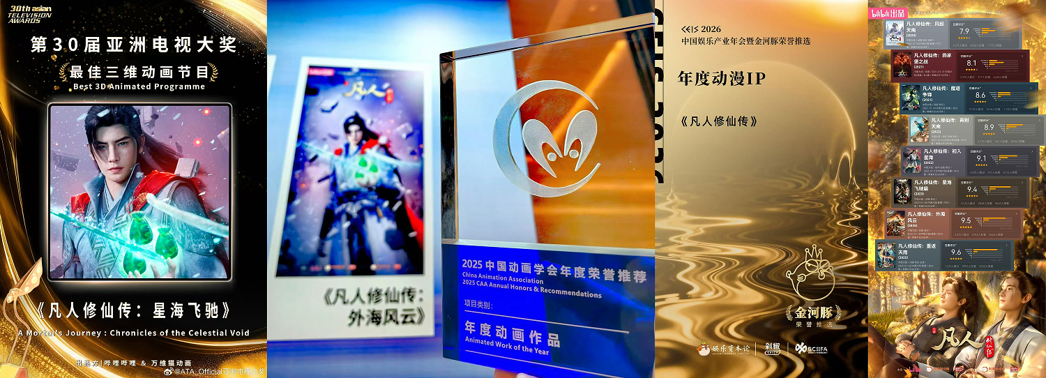 截至目前(動畫第176集),《凡人修仙傳》動畫在B站追更人數(shù)超1500萬,25年更新期間僅B站新增投稿5萬+,為B站年度國產動畫二創(chuàng)熱度榜第一,是名副其實的“國創(chuàng)典范”。在行業(yè)內,凡人動畫一年攬獲多項重磅榮譽:豆瓣2025評分最高動畫劇集、2025微博文化之夜“年度國漫IP”、第30屆亞洲電視大獎“最佳三維動畫節(jié)目”、2025中國動畫學會榮譽推薦年度動畫作品,更被央媒以年度關鍵詞點名表彰。